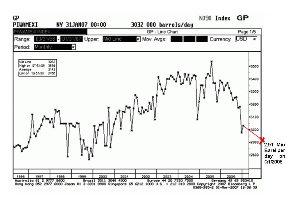 Hohe Ölpreis sind für Länder wie Mexico daher lebensnotwendig. Demonstrationen und Unruhen gibt es schon wegen der hohen Maispreise (tortilias), sollte die Ölproduktion weiter so stark fallen, wird es in wenigen Jahren sehr ungemütlich unterhalb der südlichen US Grenze im Südlichen Nachbarn. Vielleicht auch deshalb der "Eiserne Vorhang"?