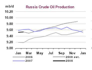 Die russische Ölproduktion fällt seit September 2007 (siehe IEA Daten aus dem Report 2008 April)- geht an den Massenmedien ziemlich vorbei. Wobei man dazu sagen muss, dass sich der Trend erst weiter bestätigen muss... Bild unten aus dem IEA report April 2008 -die dünne schwarze Linie zeigt die PRGONOSE der IEA für Russland 2008. Die dicke schwarze Linie den tatsächlichen output, der für März und April noch nicht eingezeichnet ist, März war fallend wie auch von der IEA prognostziert. Für April und die folgenden Monate hat die IEA wieder ein Ansteigen der russischen Ölproduktion erwartet. Im April ist es gefallen. Man wird die weitere gut beobachten müssen.....
