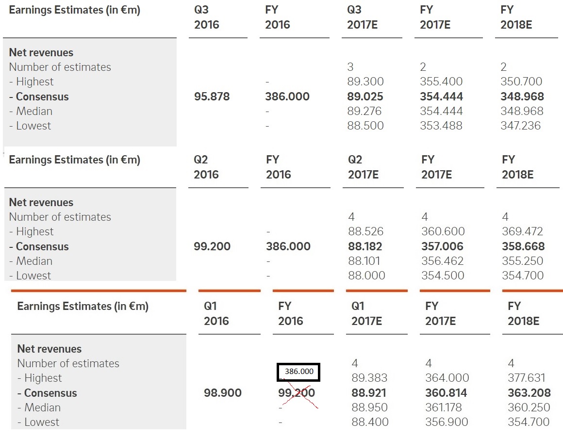 Dieser Verlust an Optimismus wird besonders deutlich,wenn man die Entwicklung dieser Schätzungen/Erwartungen betrachtet. - Ich habe dazu mal die Umsatzerwartungen der ersten drei Quartale "übereinander gelegt" .- Dort sieht man ,wie die optimistische Schätzung aus Q1 von 377,6 Mio. auf nun 350,7 Mio. weggebrochen ist!