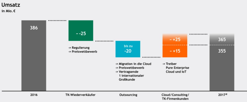 Für 2017 sieht die Planung so aus: -45 Mio Verluste (TK-Wiederverkäufer + Outsourcing ) sollen teilweise ausgeglichen werden durch 15 bis 25 Mio Umsatzplus in den Zukunftssegmenten. 386(Umsatz 2016) - 45 + 15 bzw. maximal 25 ergibt die Zielrange 355 bis 365 für 2017.