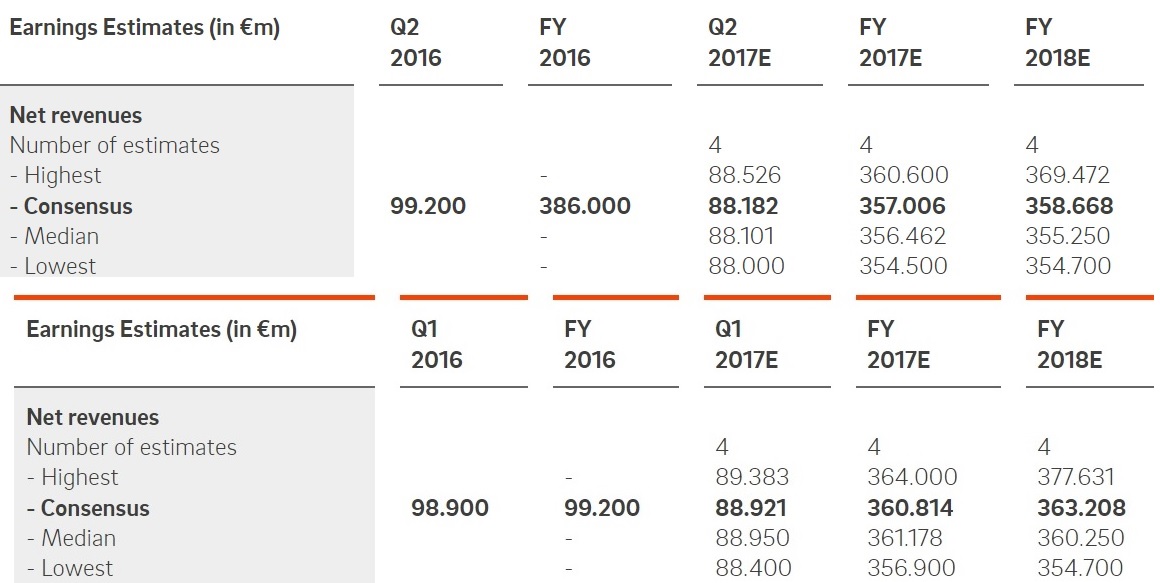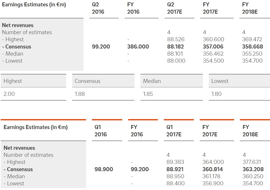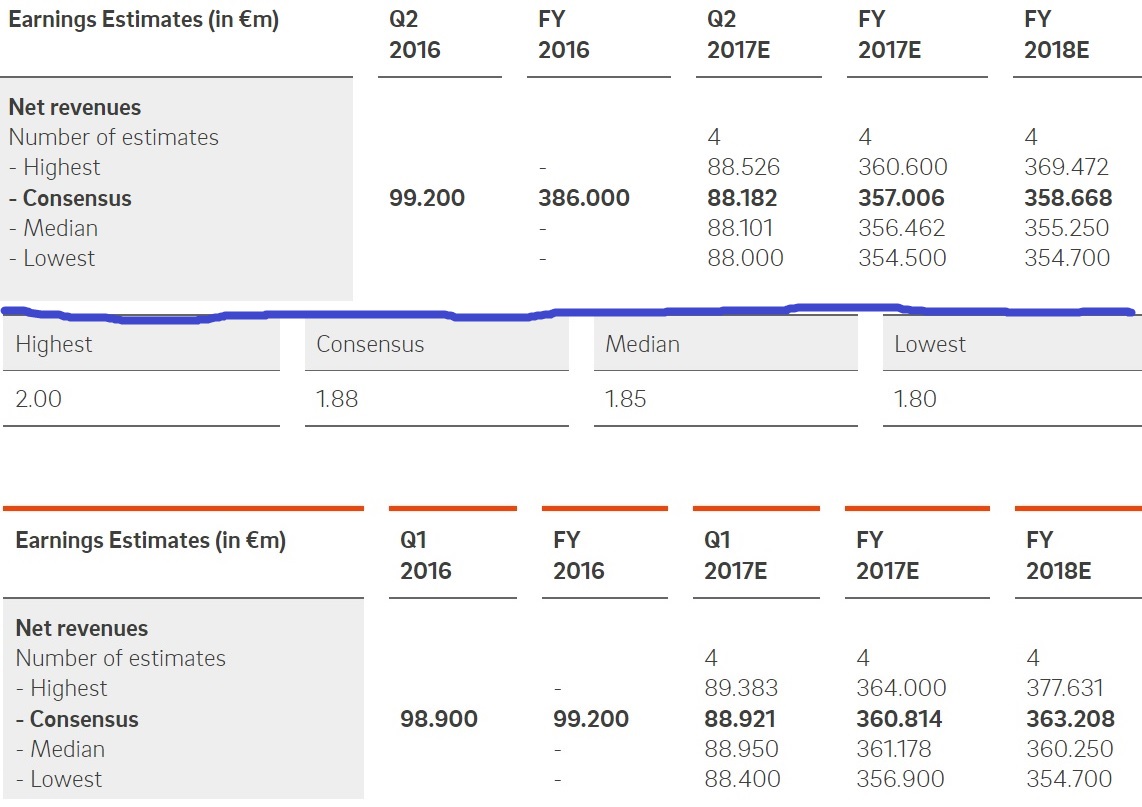 - zwei von diesen 4 (Bankhaus Lampe; Commerzbank; Oddo Seydler Bank; Warburg Research) sehen sogar für 2018 bestenfalls Stagnation beim Jahresumsatz!