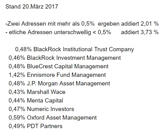 Prozentsatz des ausgegebenen Aktienkapitals: 0,49 % ----------------------------------- Jetzt gibt es offiziell nur noch Ennismore mit 1,42 %. - Der ganze Rest ist undurchsichtig,weil unter 0,5% nur noch der Bafin gemeldet werden muß und nicht mehr der Öffentlichkeit .