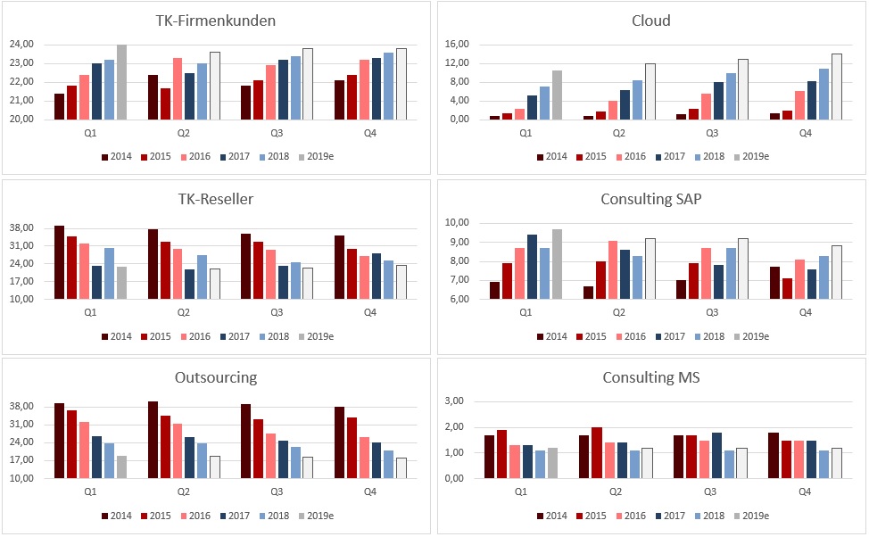 Sorry … deine Sinne sind vernebelt... :) Cloud war in Q1 schwächer als Q4.18 … die Wachstumsdynamik lässt jetzt schon nach, wenn man von Q zu Q schaut … im Vergleich mit q-4 sieht es NOCH gut aus … also brauchen sie jetzt Investmittel, damit sie Wachstum puschen können, sonst gehen die schön +30%-Zahlen ab Q3.19 arg nach unten... TK Corp. weist langsam aber kontinuierliches Wachstum aus Consulting rechnet immer viel in Q1 ab … Outsourcing bricht seit Q2.2015 total ein … irgendwann ist auch das Argument von 2 Kundenverlusten mehr als ausgelutscht... der Konzern braucht seit Q4.17 eigentlich ne neue Ausrede.