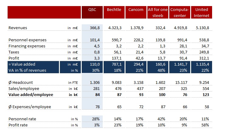 Sehr kritisch zu sehen, ist natürlich das diese Kennzahl von QSC über viele viele Perioden hinweg immer weiter rückläufig ist. Die Quick-wins aus der Sprachterminierung haben das etwas kaschiert aber der Trend war/ist rückläufig … Die Grundaussage, dass QSC aber Anpassungen vornehmen MUSS (entweder weniger Personal ODER mehr Vertriebsaktivitäten) sind richtig und notwendig. Auch wenn QSC aus eigenen Präsentationen eine unschlagbares Produktportfolio hat (wer das glaubt, bitte schön!) - in finanzwirtschaftliche Erfolge können sie das nicht ummünzen … da steht die Konkurrenz besser da … (Bechtle, Cancom, Steeb, etc.)