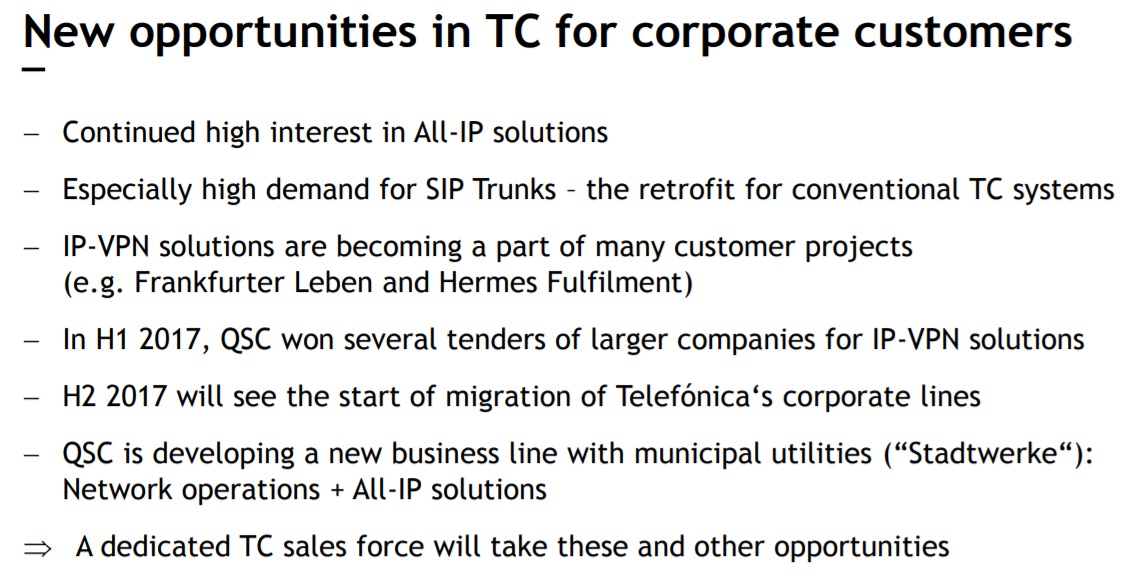 "Mit der Umsetzung der Pläne sei deswegen nicht vor Mai 2018 zu rechnen. Die Kosten für die Aufspaltung habe QSC auf einen einstelligen Millionenbetrag beziffert. Die Pläne seien positiv zu werten, weil sie eine Chance darstellen würden, das Telekommunikationsgeschäft zu stabilisieren oder hier sogar eine Trendwende einzuleiten"